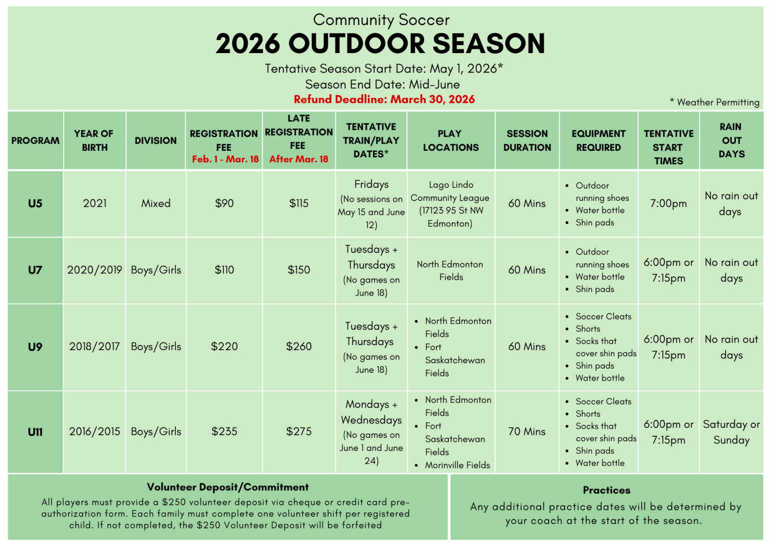 Every effort is made to accommodate player and coach requests however this is not guaranteed. Players may have to transfer to surrounding communities if there aren’t enough to form a team. Registration is still required in the community in which the player resides. Fields: Games are played throughout North East Edmonton. Home fields for Horse Hill Community are Horse Hill School and Brintnell Park.